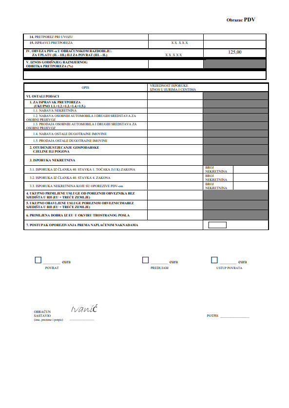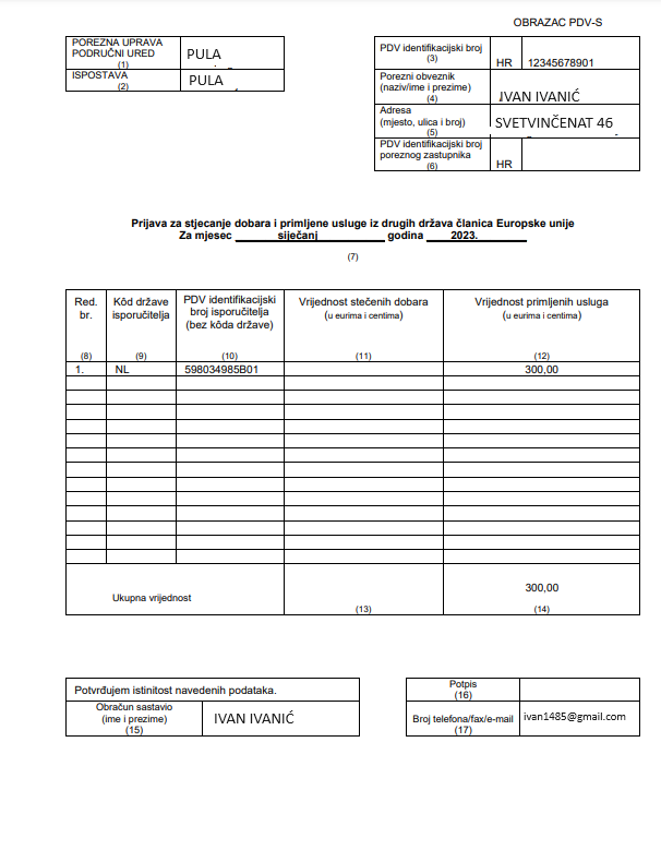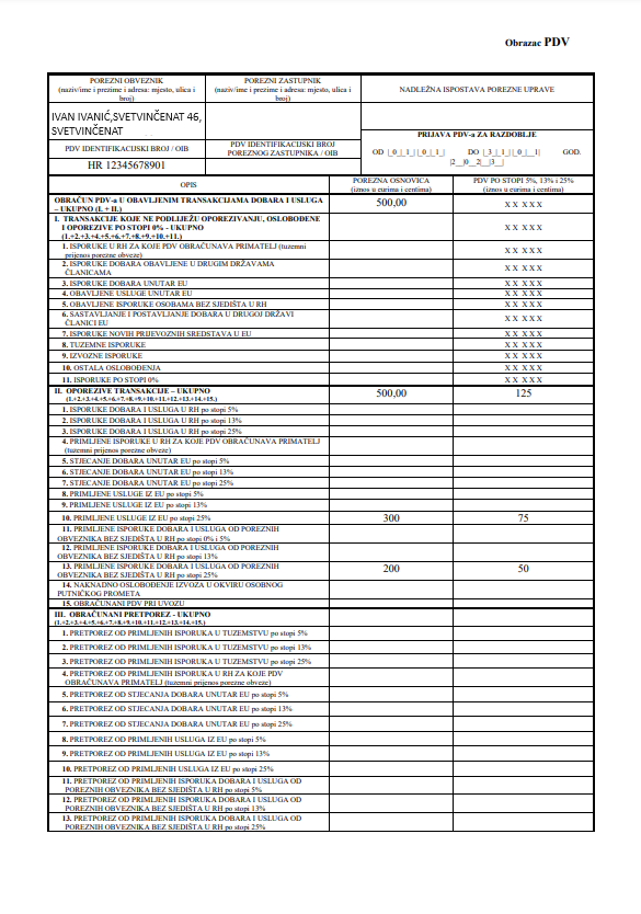 Na primljenu uslugu potrebno je obračunati hrvatski PDV po stopi od 25%. Obrazac PDV i Obrazac PDV-S treba podnijeti samo za obračunska razdoblja u kojoj je usluga primljena. Obrasci s nulom se ne podnose.